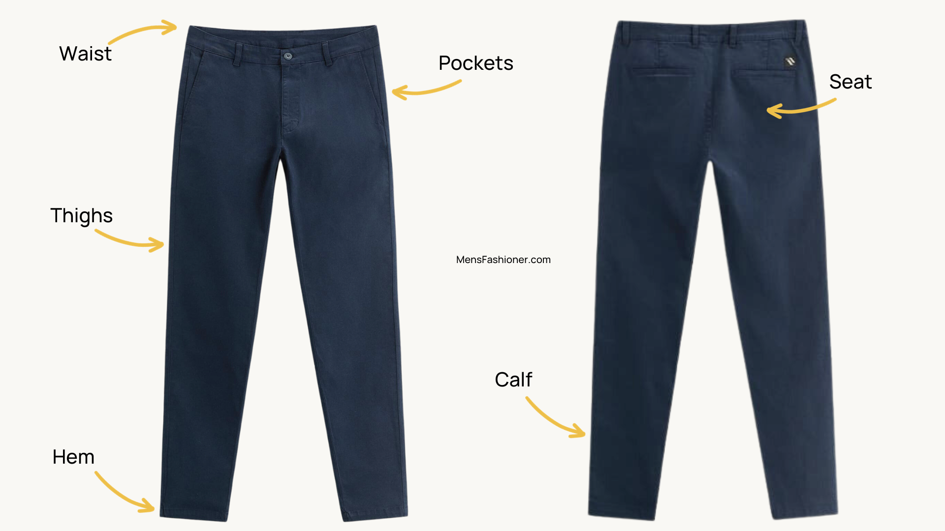 Chino pants will also usually have side-loading pockets, which are different than the traditional front or top-loading pockets traditionally found on jeans.
