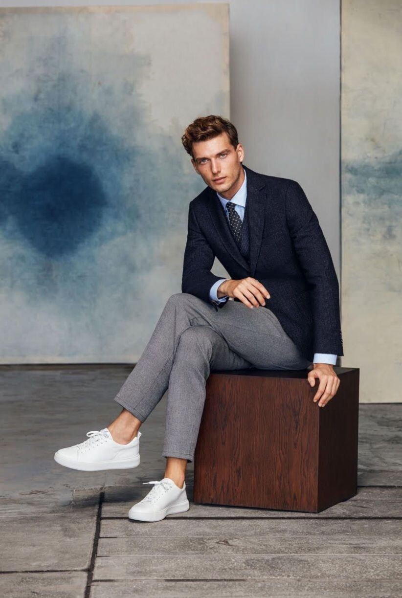 Here we can see how a dress shirt works as the perfect foundation for your stylish business-casual outfits and take note that you should really only wear a tie if you're wearing a jacket (sports coat/ trucker/ bomber) over your shirt. Also, remember to keep those white sneakers impeccably clean and you should also be tucking in the laces for a more elevated and polished look.