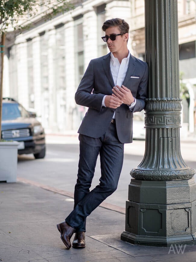 While you can wear Oxford shirts with suits, I don’t dress my clients this way. The buttoned-down collar lends a more casual vibe to the shirt and takes attention away from the formality of a suit. Unless you’re going without a tie when wearing a suit, it’s just not my preference, but it’s acceptable. I normally pair them with a notch lapel suit (no tie), Blazer, Harrington Jacket, sweater, or by itself with the sleeves rolled up.