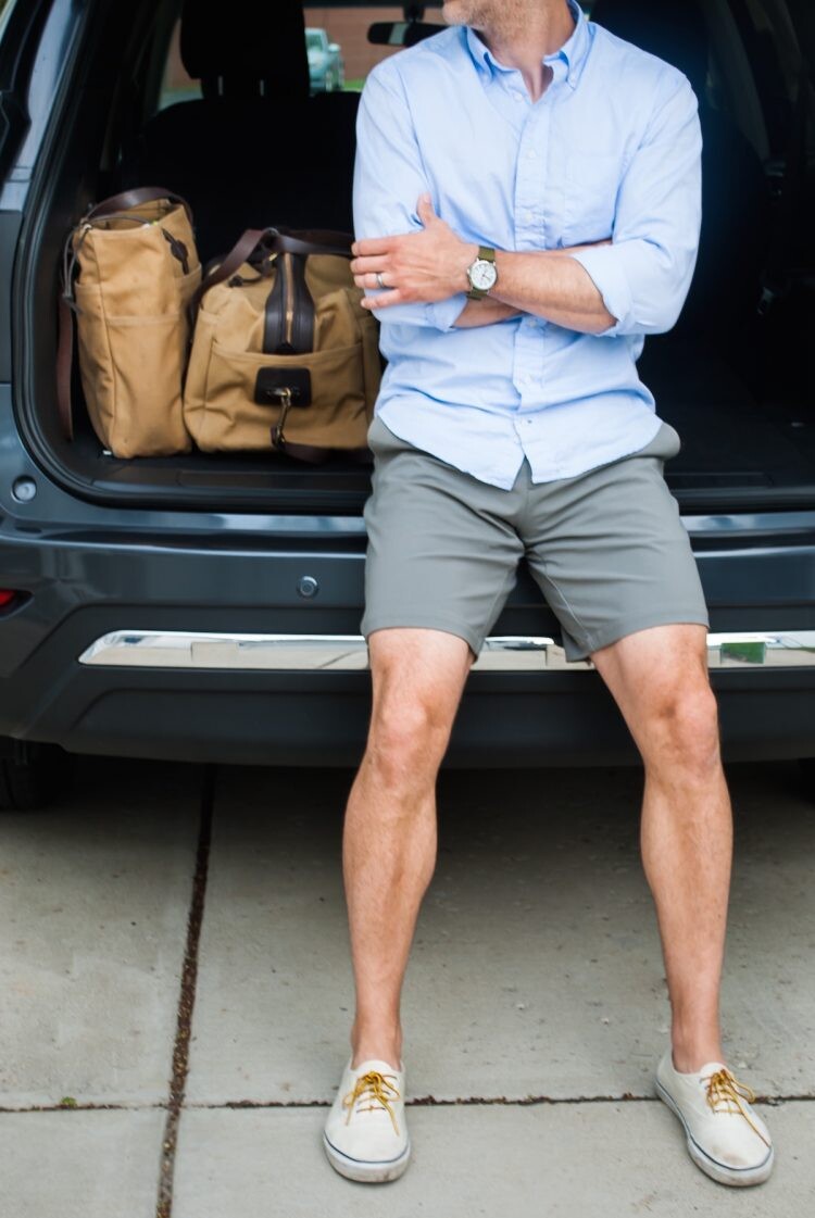When the weather starts to heat up, an Oxford dress shirt is a smarter alternative to your go-to crewneck t-shirt. White would also work here and you can always swap out those gray shorts for a tan or navy pair instead.