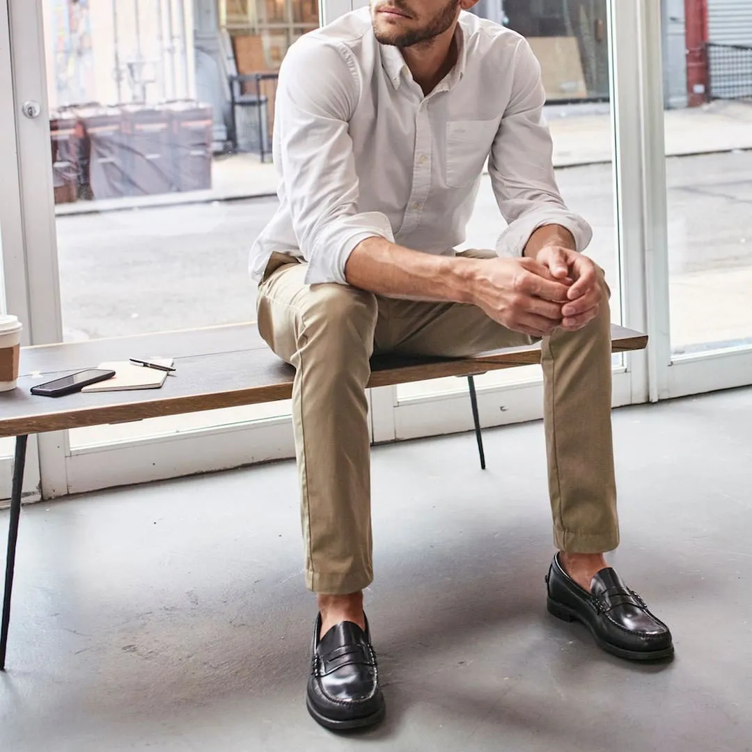 If the black dress shoes are a bit too heavy for your liking, then you could always swap them out for a pair of brown Oxford dress shoes instead. Navy chinos would also work here or if you wanted to dress it up further, you could go for a pair of navy or charcoal wool trousers.