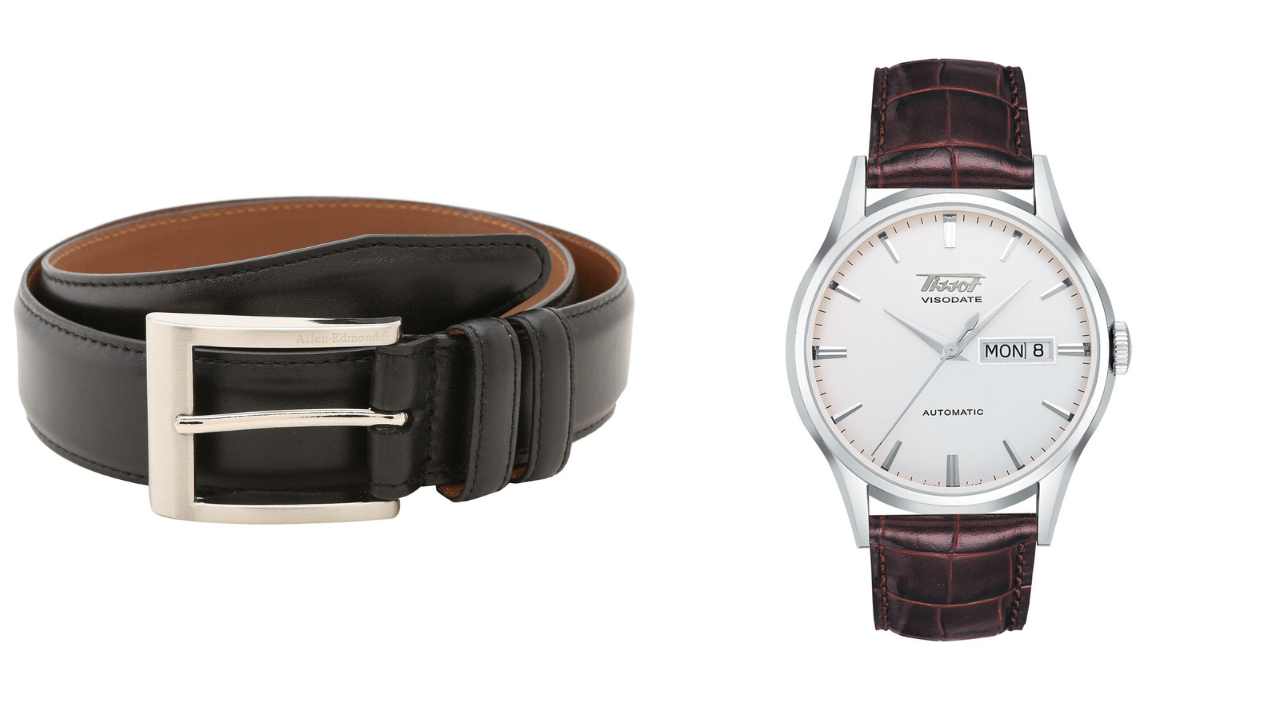 Brown shoes = brown belt and watch strap.