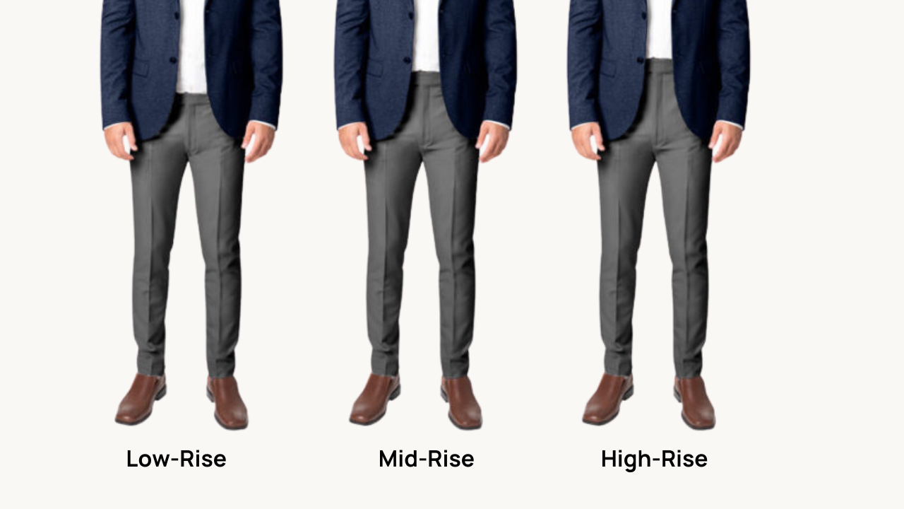 For your suit pants, a classic mid-rise will leave the waistband sitting at the mid-to-high hip level (just below your belly button).