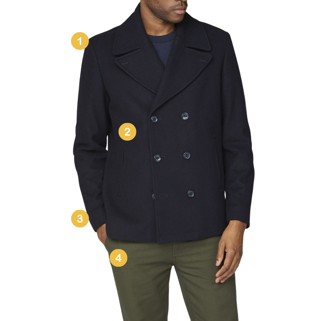 You want the shoulder seams of your peacoat to end where your shoulders naturally end – where they start curving down to your arm, basically.