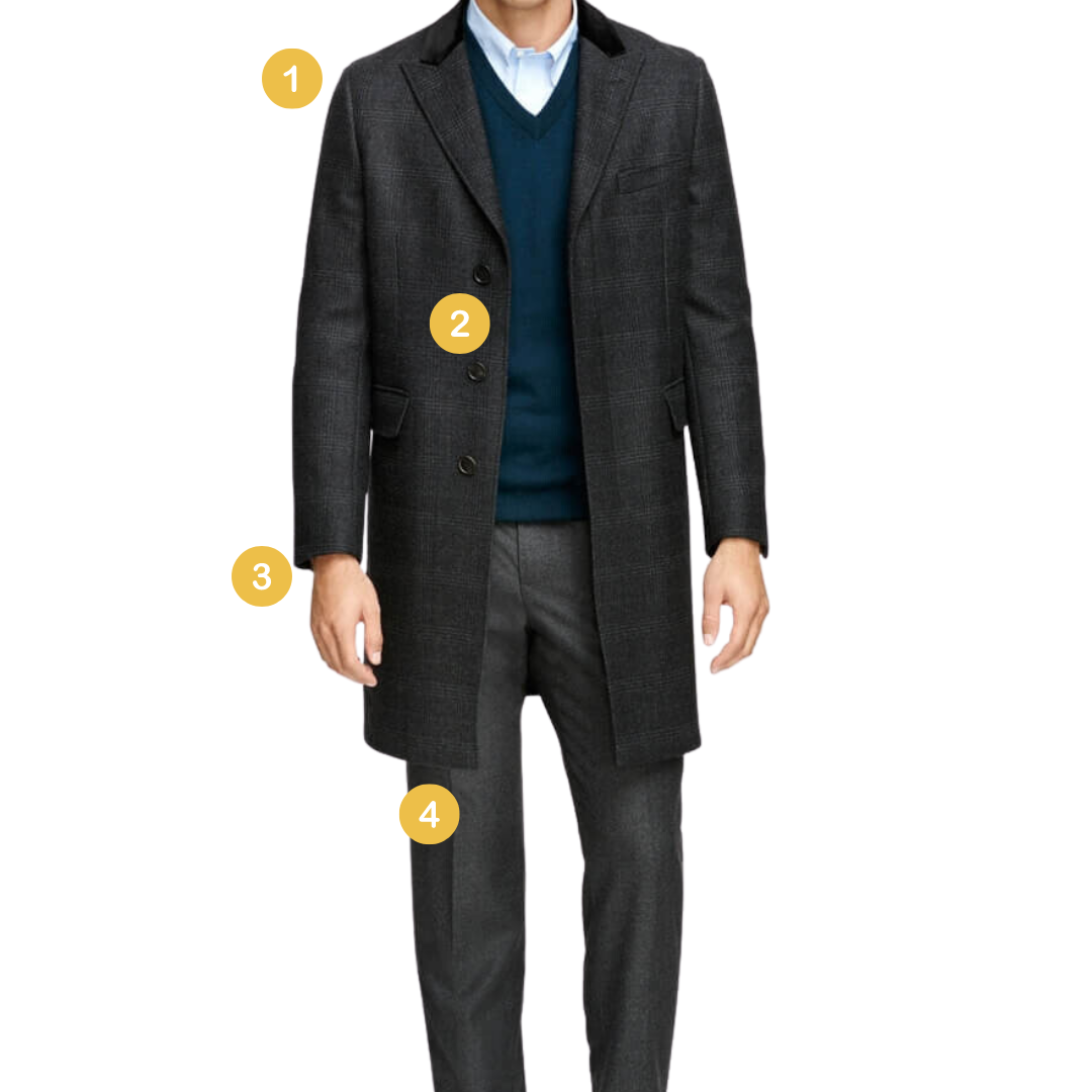 No matter what climate you live in, your overcoat should end somewhere above your knee – never longer. Aim for the mid-thigh area.