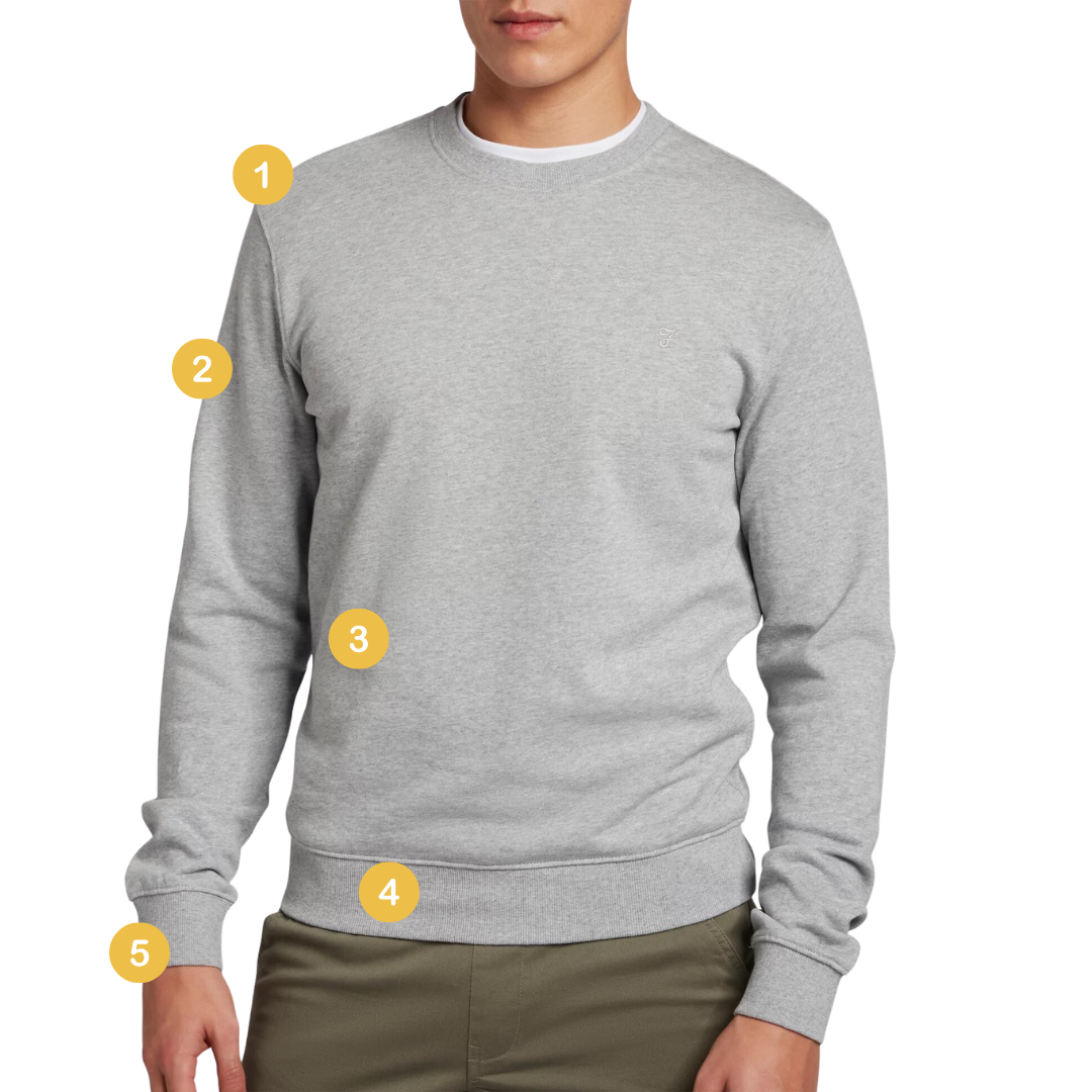 Unlike sweaters and cardigans, sweatshirts are always made of cotton (or a cotton blend), so stick with that. It can be a blend with a little stretch, but no more than a single-digit percentage otherwise it'll look overly shiny in person.