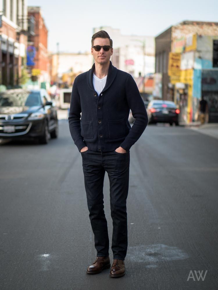 Here we can see how a cardigan works as the perfect middle ground between a shirt and a crewneck sweater here. If you wanted to add some extra insulation, you could always wear a charcoal overcoat on top.
