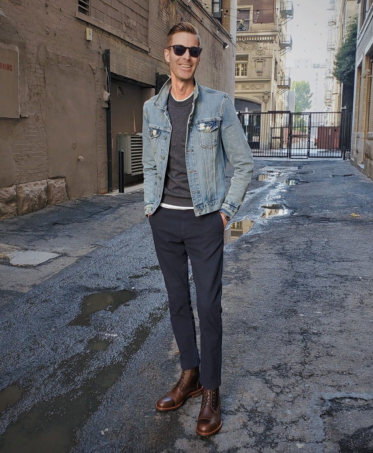 Here, we're blending dressy and casual items, combining smart wool trousers with a laidback trucker jacket. Notice how the white crewneck tee under the sweater adds a refreshing pop of color to the overall look.